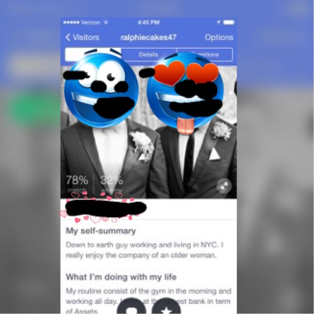 Photo-editing aside, whichever suited suitor in the photo this summary is for, he already enjoys the company of “an older woman.” Why go on Match.com then? Possibly to talk about his supposed gym routine…maybe no one in real life (including said “older woman”) wants to hear about his daily fitness and employment patterns.